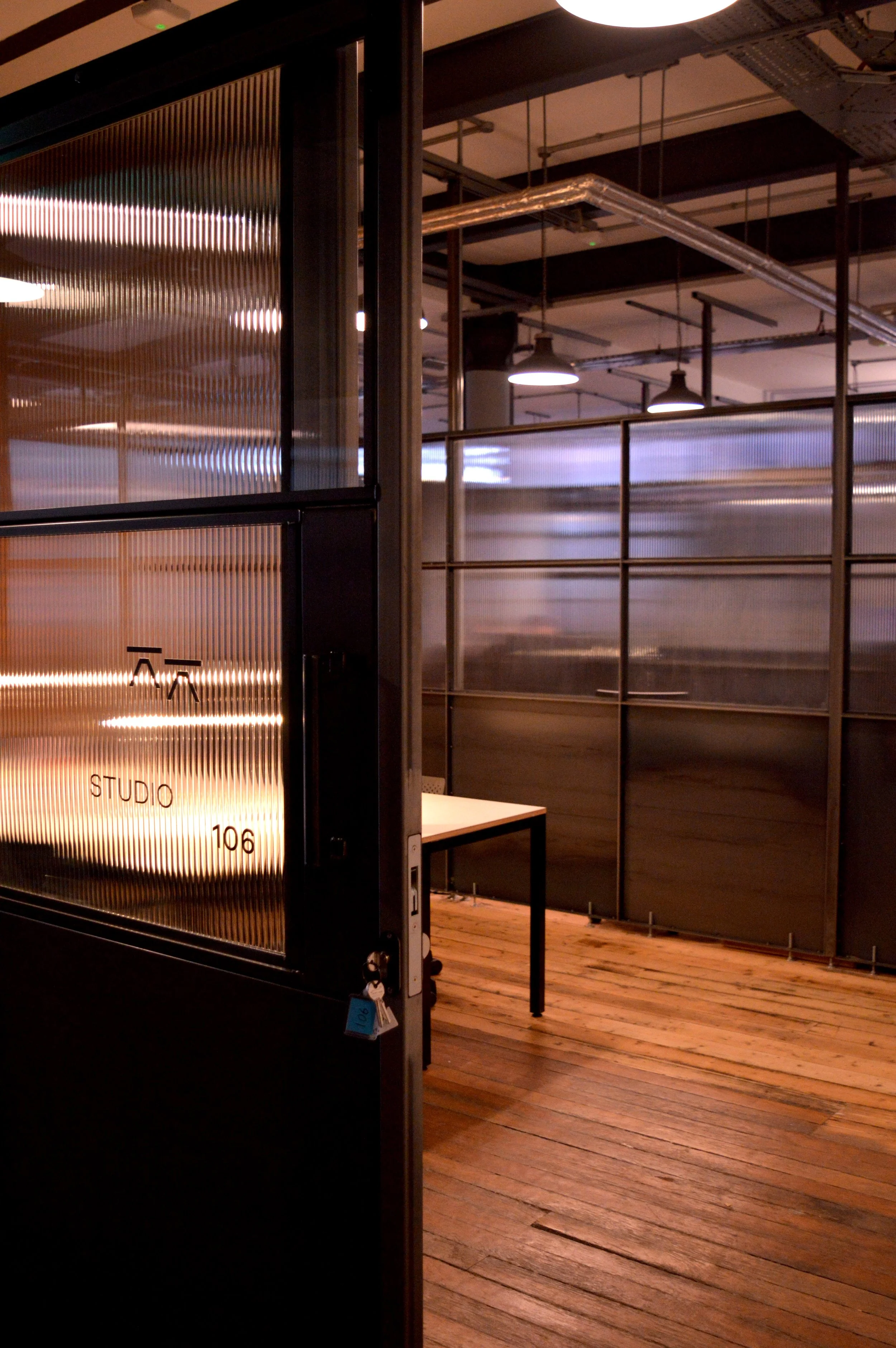 It has two steel & glass partitioned walls, one red brick wall, one white wall & original hardwood floors. Studios come furnished with desks & chairs.