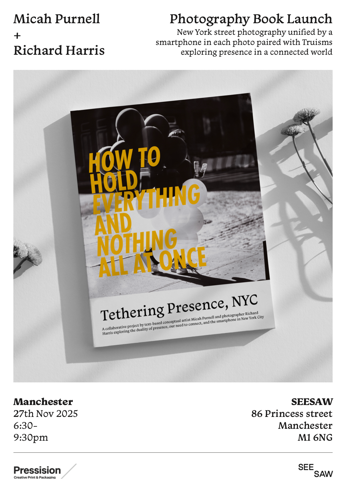 A book launch of ‘Tethering Presence, NYC’, a bold new coffee table book of truisms by Micah Purnell, & New York street photography by Richard Harris.