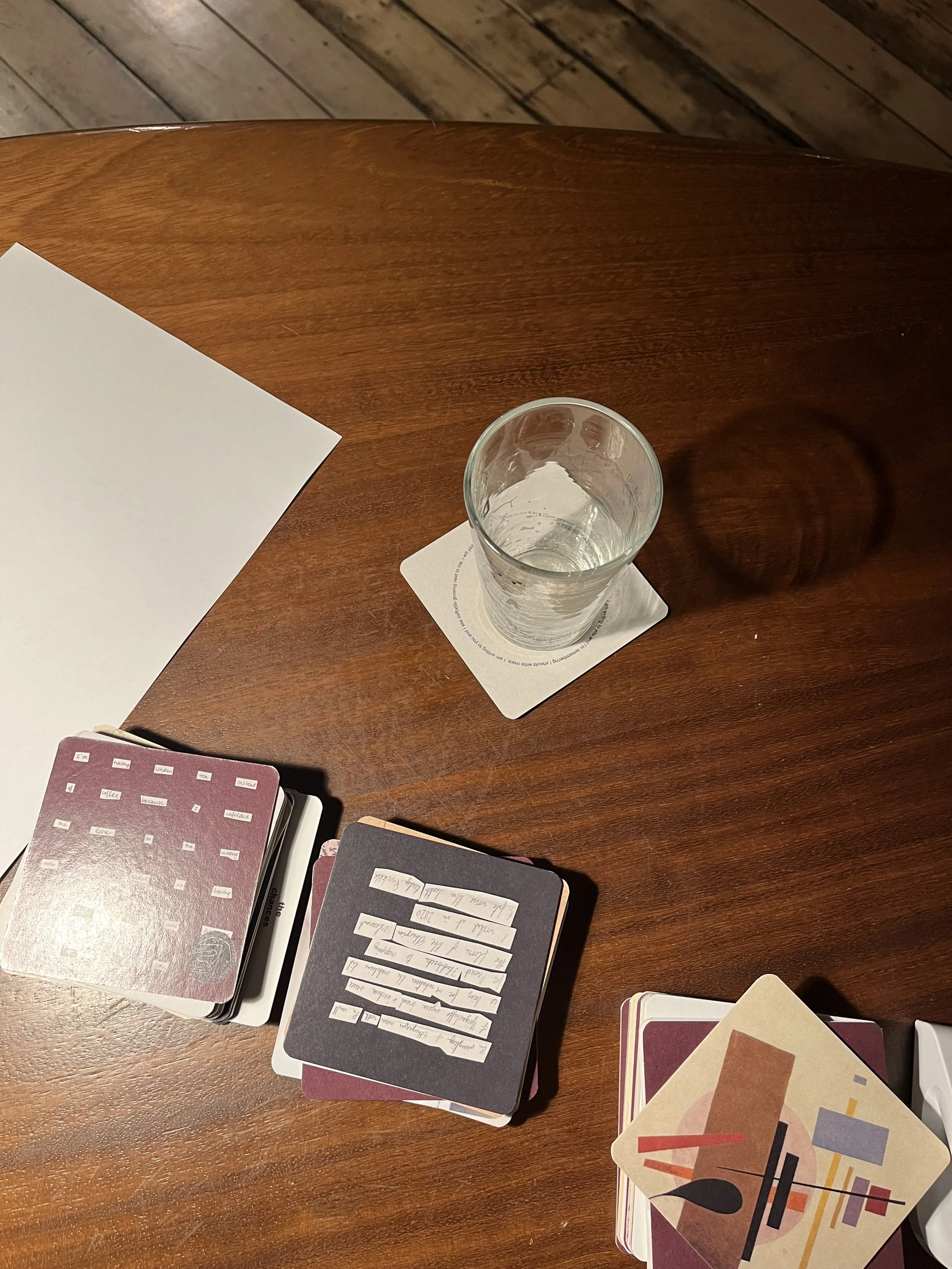 Spill is a cafe intervention comprising twenty-five set-of-ten recycled paper coasters and fifteen instructional letters.